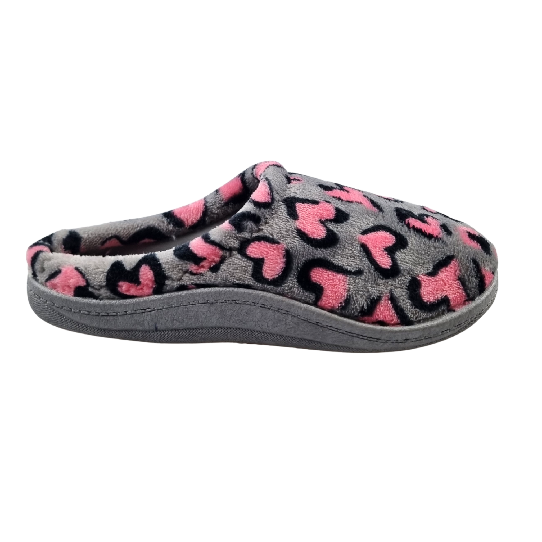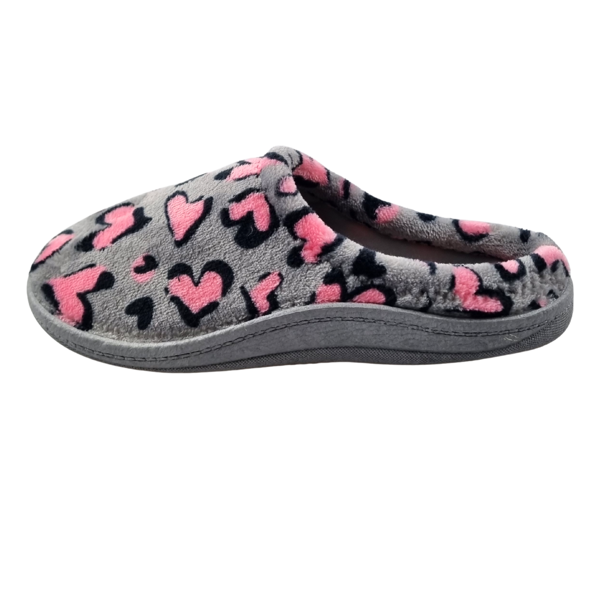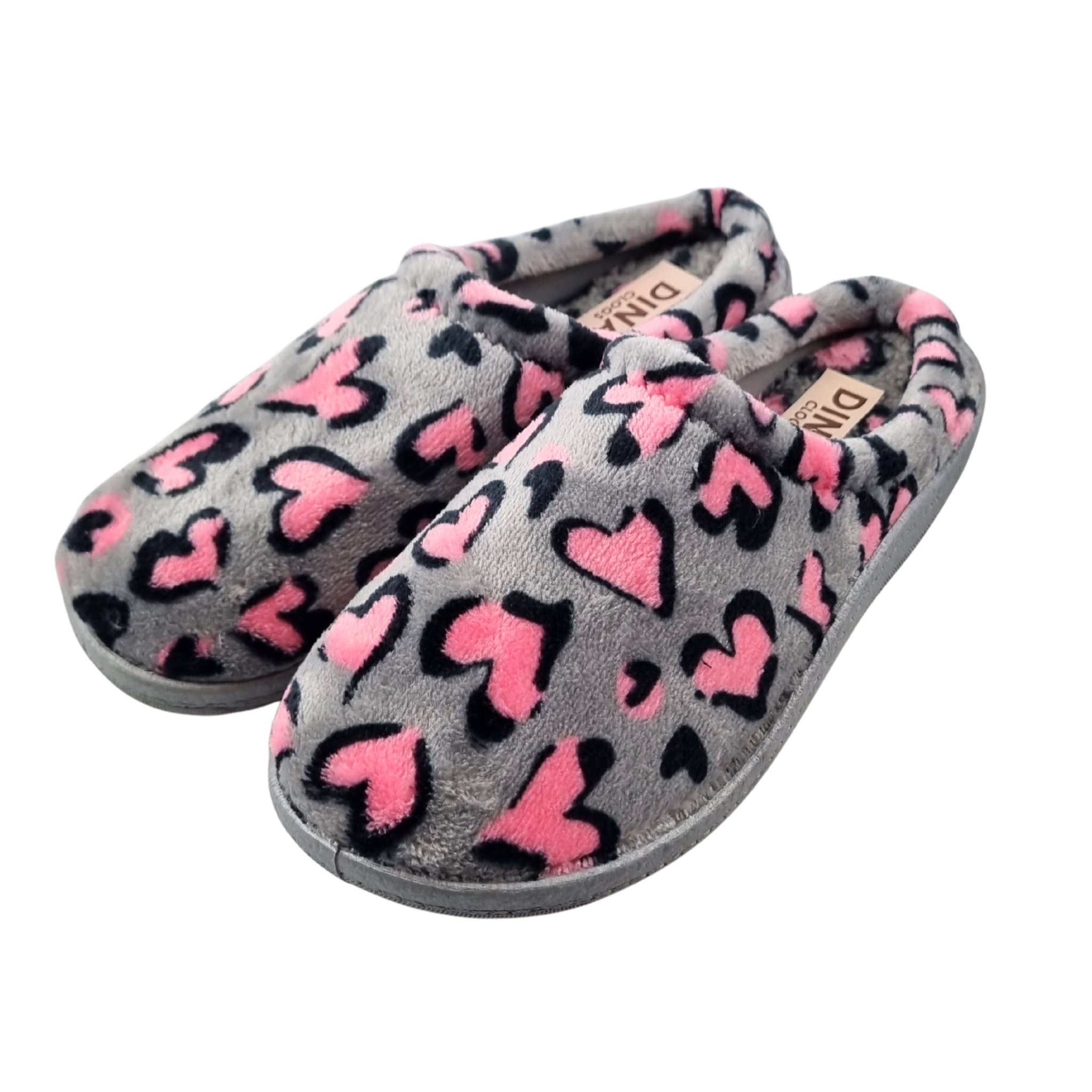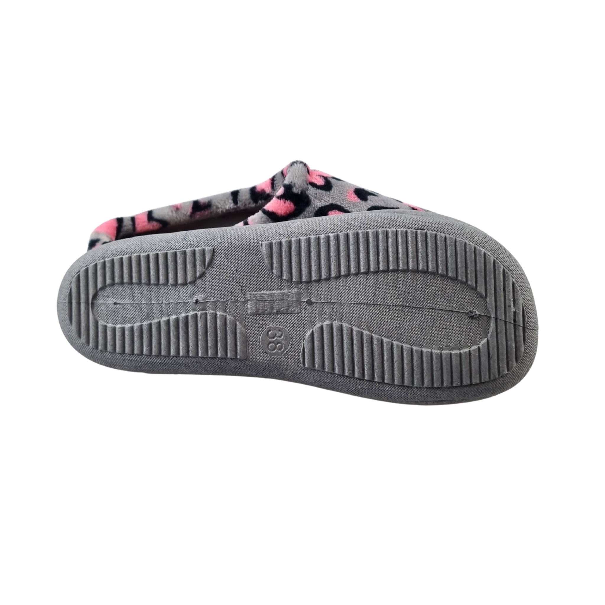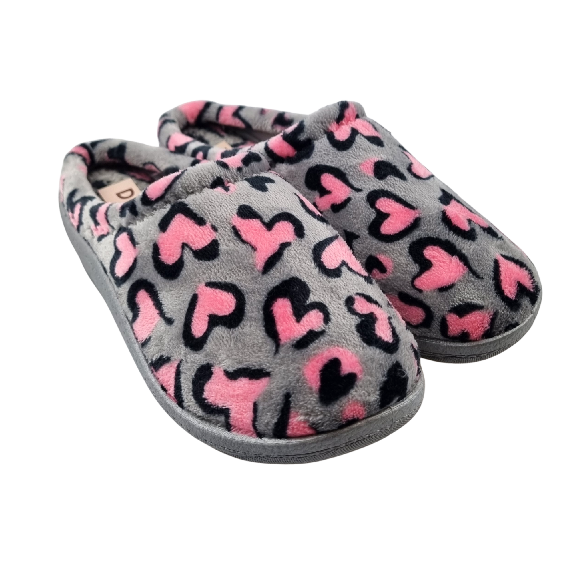Damen-Slipper grau mit Panther-Herz-Muster – wunderbar weich mit fester Sohle