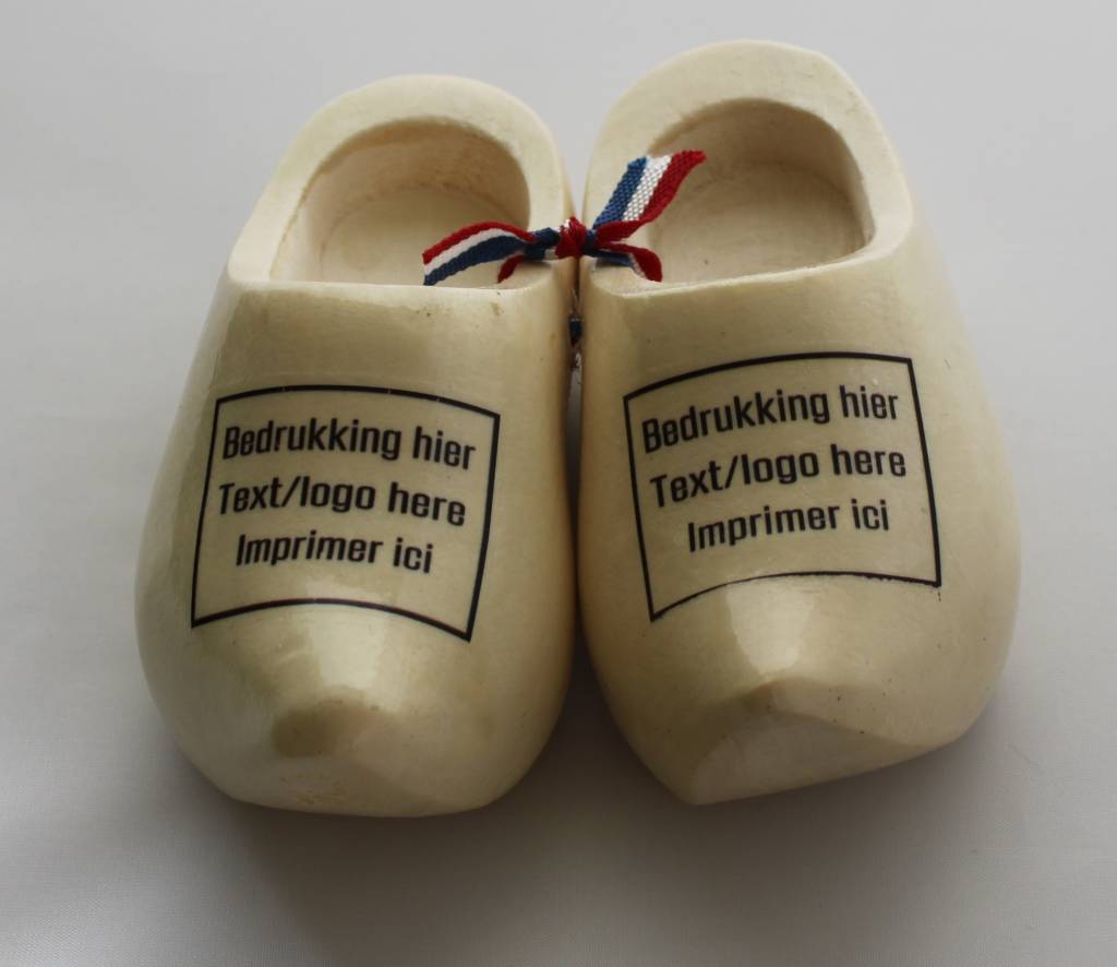 Die Souvenirpaare sind 12 cm lang und die linken und rechten Clogs sind mit einem rot / weiß / blauen Band aneinander befestigt.