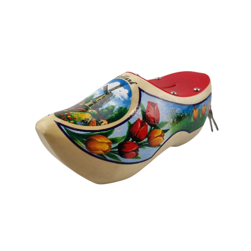 Diese Holzschuh-Spardose ist mit einem traditionellen Mühlendekor versehen.