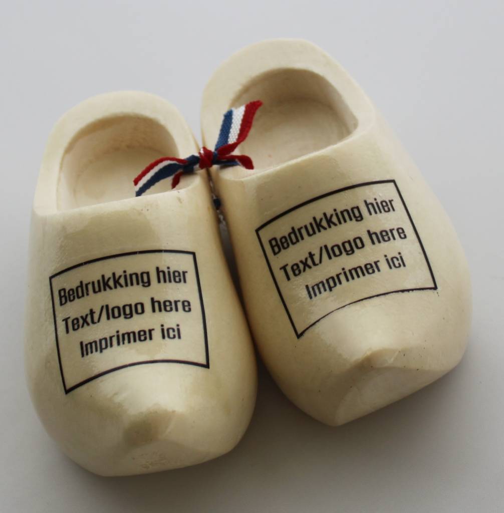 De souvenirpaartjes zijn 12cm lang en de linkse en de rechtse klomp zijn aan elkaar bevestigd met een rood/wit/blauw lint.